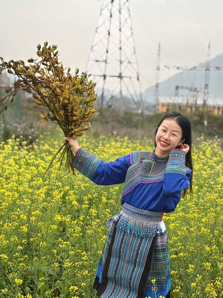 Du khách trong trang phục truyền thống giữa cánh đồng hoa vùng cao Bình Lư , góp phần tôn lên vẻ đẹp văn hóa bản địa và sức hấp dẫn của du lịch trải nghiệm Lai Châu mùa Xuân.