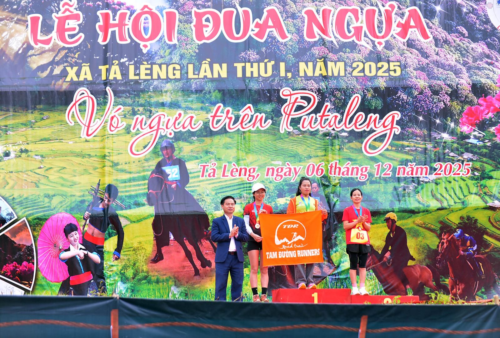 Các đồng chí: Trần Mạnh Hùng – Giám đốc Sở Văn hóa, Thể thao và Du lịch tỉnh; Hoàng Văn Trinh - Bí thư Đảng ủy xã Tả Lèng; Phong Vĩnh Cường - Chủ tịch UBND xã Tả Lèng trao cờ lưu niệm cho các nài ngựa tham dự lễ hội.