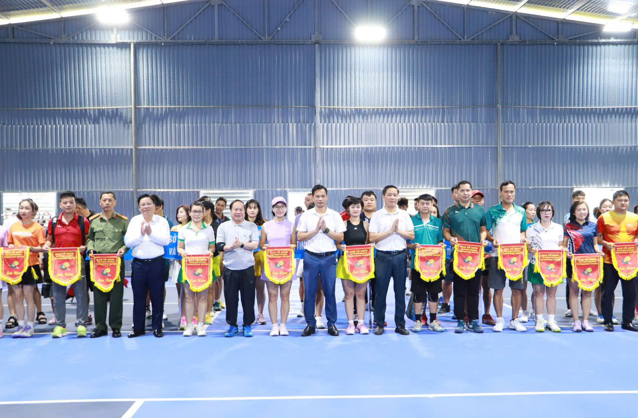 Các đồng chí lãnh đạo tỉnh và Ban Tổ chức trao cờ lưu niệm cho các đoàn vận động viên tham dự Giải Vô địch Pickleball tỉnh Lai Châu lần thứ I năm 2025 – Tranh Cúp Zocker