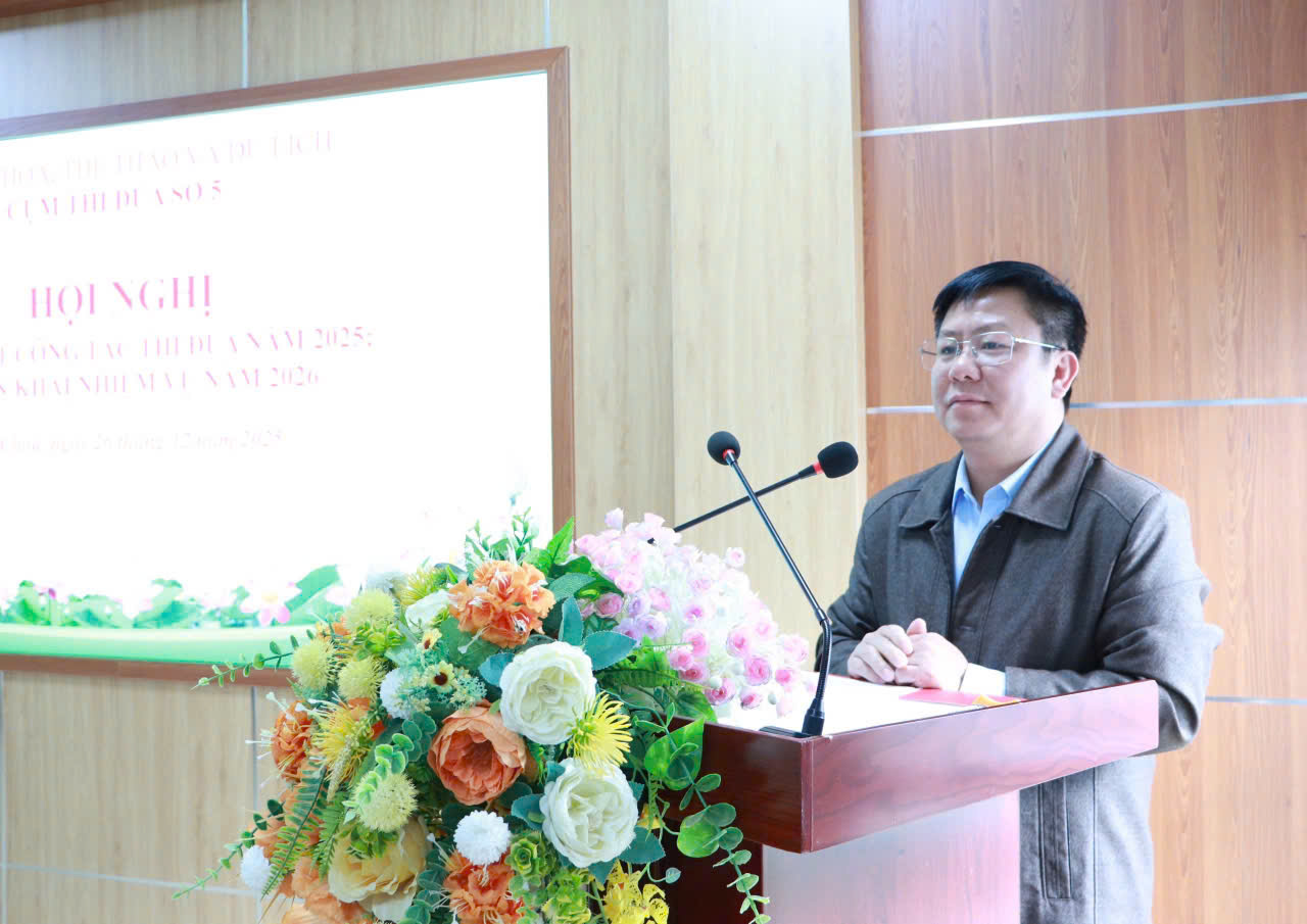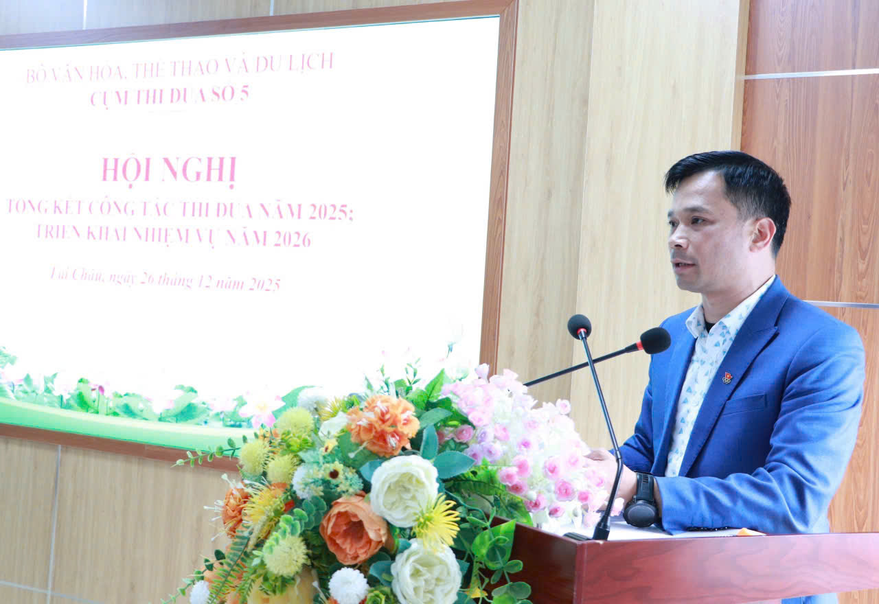 Tại Hội nghị, đồng chí Trần Văn Công – Phó Giám đốc Sở Văn hóa, Thể thao và Du lịch tỉnh Lai Châu đã trình bày báo cáo tổng kết phong trào thi đua, công tác khen thưởng năm 2025 và phương hướng, nhiệm vụ trọng tâm năm 2026. Báo cáo khẳng định các đơn vị trong Cụm đã bám sát sự lãnh đạo, chỉ đạo của cấp ủy, chính quyền các cấp; triển khai nghiêm túc các quy định của Luật Thi đua, khen thưởng và các văn bản chỉ đạo của Trung ương, Bộ Văn hóa, Thể thao và Du lịch và UBND các tỉnh.