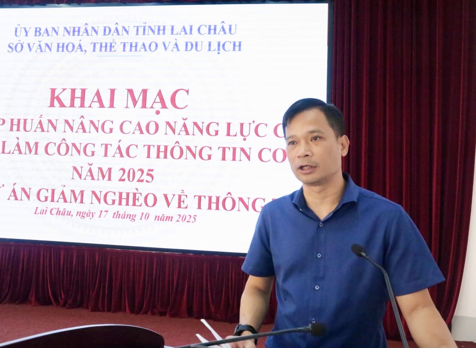 Sáng nay (17/10), tại phòng họp A3 - Trung tâm Hội nghị Văn hóa tỉnh Lai Châu, Sở Văn hóa, Thể thao và Du lịch tổ chức khai mạc lớp tập huấn nâng cao năng lực cho cán bộ làm công tác thông tin cơ sở năm 2025 (thuộc Tiểu dự án Giảm nghèo về thông tin thuộc Chương trình mục tiêu quốc gia Giảm nghèo bền vững năm 2025).