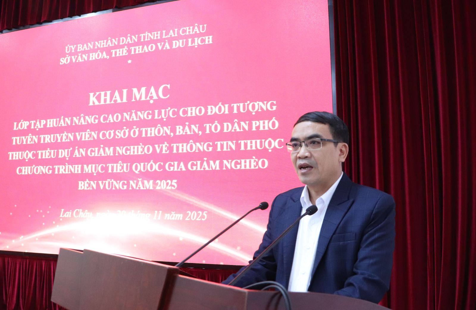 Sáng nay (20/11), tại phòng họp A3 - Trung tâm Hội nghị Văn hoá tỉnh Lai Châu, Sở Văn hoá, Thể thao và Du lịch tổ chức khai mạc Lớp tập huấn nâng cao năng lực cho đối tượng tuyên truyền viên cơ sở ở thôn, bản, tổ dân phố thuộc Tiểu dự án Giảm nghèo về thông tin thuộc Chương trình mục tiêu quốc gia Giảm nghèo bền vững năm 2025.