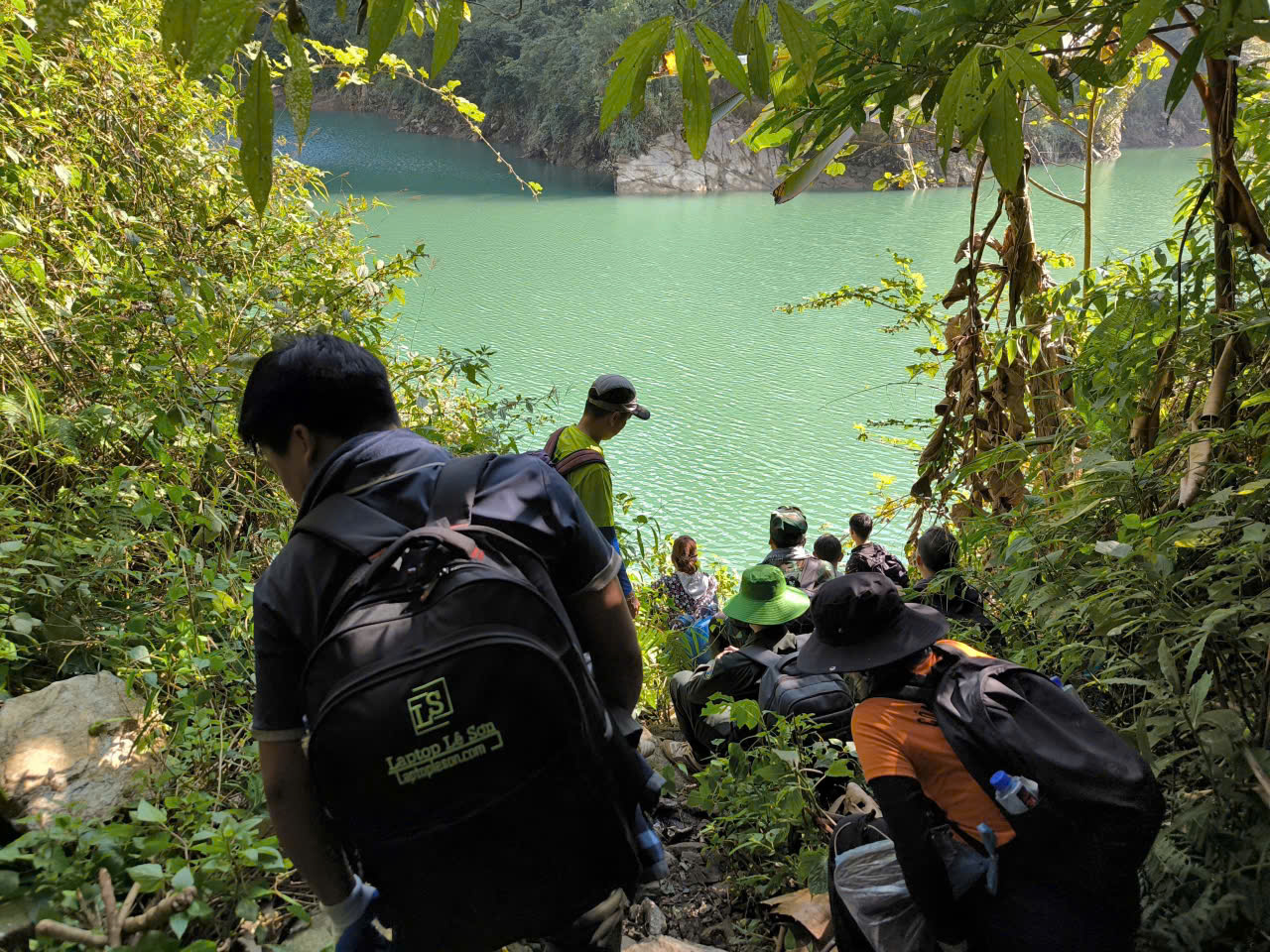 Đoàn công tác khảo sát thực địa, vượt suối, tiếp cận các điểm có tiềm năng phát triển du lịch.