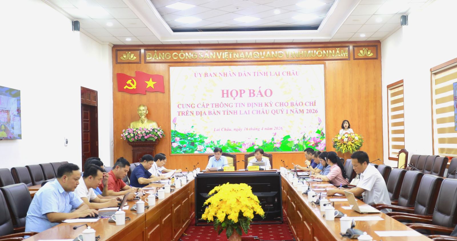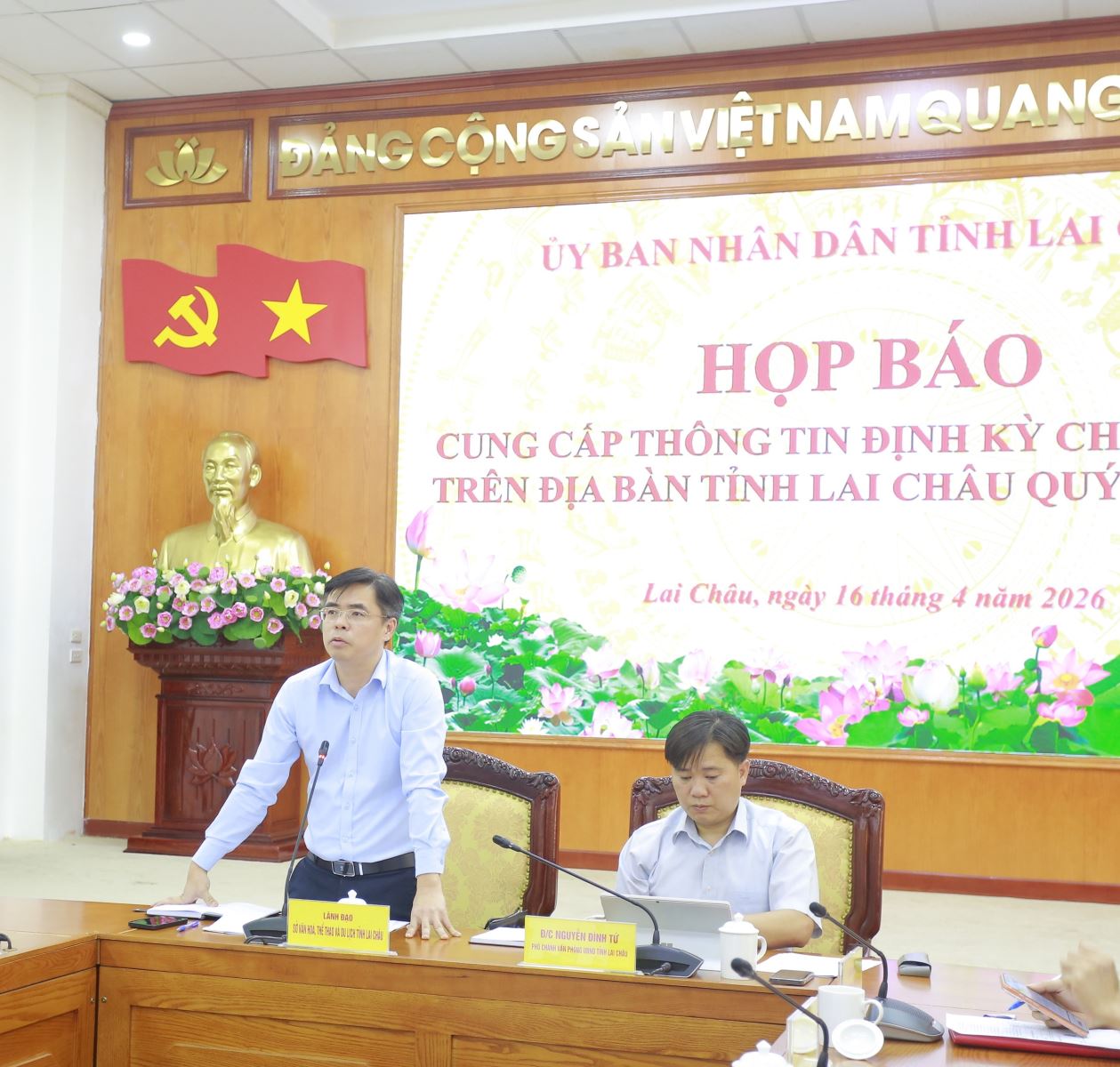 Chiều nay (16/4), UBND tỉnh Lai Châu tổ chức Họp báo thường kỳ quý I, năm 2026. Đồng chí Nguyễn Đình Tứ - Phó Chánh Văn phòng UBND tỉnh và đồng chí Trần Quang Kháng, Phó Giám đốc Sở Văn hóa, Thể thao và Du lịch được uỷ quyền phát ngôn của UBND tỉnh đồng chủ trì Họp báo.