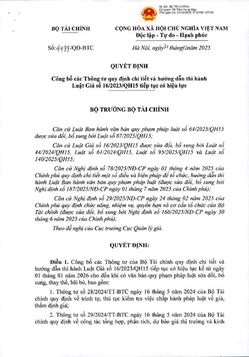 | Tiêu đề văn bản | QUYẾT ĐỊNH Công bố các Thông tư quy định chi tiết và hướng dẫn thi hành Luật Giá số 16/2023/QH15 tiếp tục có hiệu lực | ||