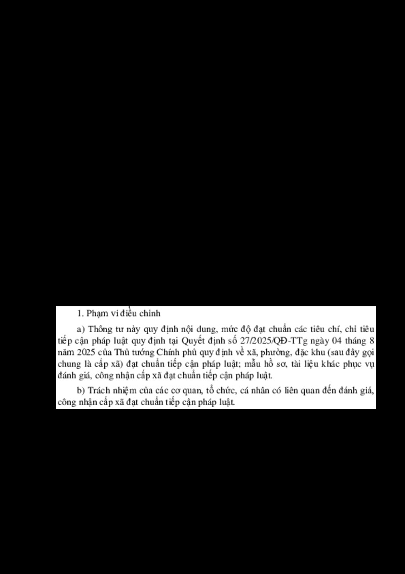 Tiêu đề văn bản | THÔNG TƯ Hướng dẫn thi hành Quyết định số 27/2025/QĐ-TTg ngày 04 tháng 8 năm 2025 của Thủ tướng Chính phủ quy định về xã, phường, đặc khu đạt chuẩn tiếp cận pháp luật | ||
