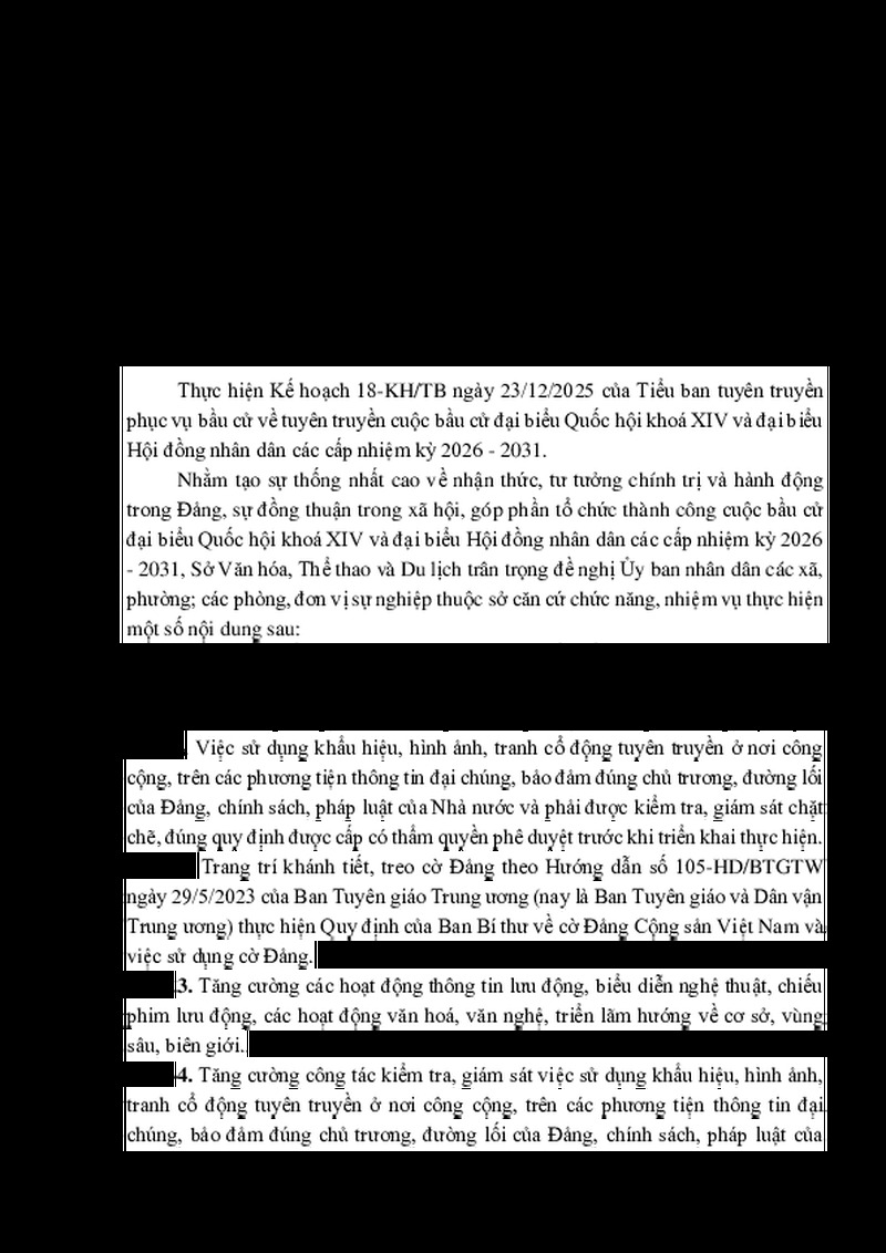 | Tiêu đề văn bản | V/v triển khai đợt cao điểm tuyên truyền cổ động trực quan chào mừng cuộc bầu cử đại biểu Quốc hội khoá XIV và đại biểu Hội đồng nhân dân các cấp nhiệm kỳ 2026 - 2031 | ||