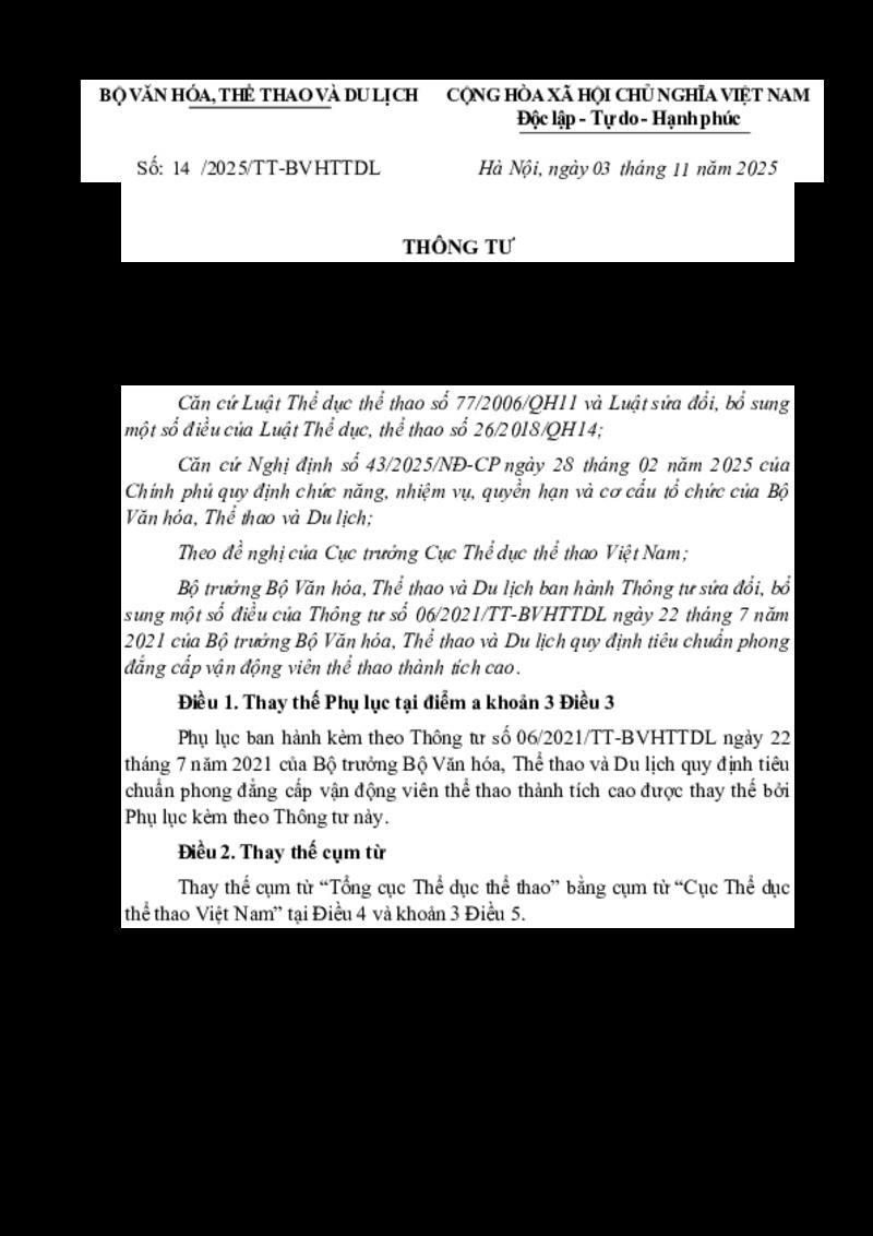 | Tiêu đề văn bản | Thông tư sửa đổi, bổ sung một số điều của Thông tư số 06/2021/TT-BVHTTDL ngày 22 tháng 7 năm 2021 của Bộ trưởng Bộ Văn hóa, Thể thao và Du lịch quy định tiêu chuẩn phong đẳng cấp vận động viên thể thao thành tích cao | ||
