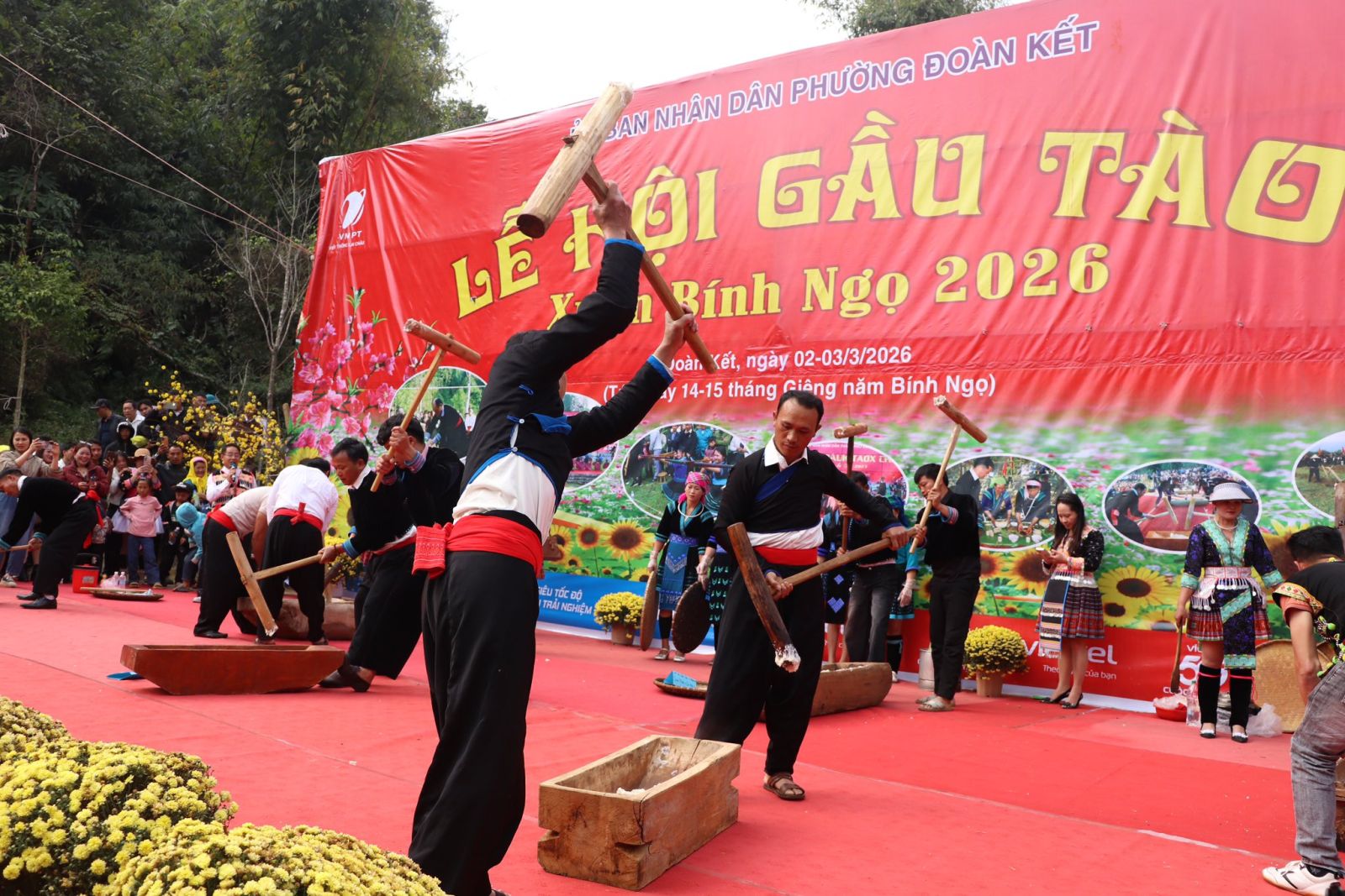Các đội tham gia thi giã bánh dày sôi nổi tại Lễ hội Gầu Tào Xuân Bính Ngọ 2026.
