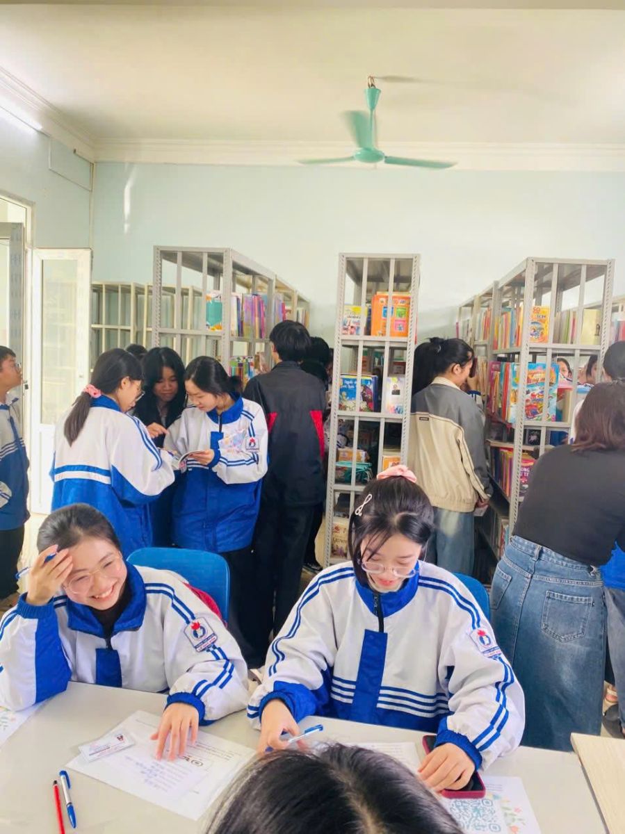 Tiếp nối chuỗi hoạt động này, chiều ngày 11/11, Thư viện tỉnh Lai Châu đã đón 35 học sinh của lớp 12C1 chuyên Anh trường THPT chuyên Lê Quý Đôn đến thư viện tham quan, học tập, trải nghiệm và vui chơi. Với chủ đề “Văn hóa đọc với học sinh” các em được tham gia nhiều hoạt động bổ ích như: Tìm hiểu về vai trò của văn hóa đọc, đố vui kiến thức tìm hiểu về các tác phẩm nổi tiếng và những tấm gương ham học, ham đọc như: Hồ Chí Minh, Mạc Đĩnh Chi, Trần Đại Nghĩa, Nguyễn Khuyến, tìm hiểu sự hình thành và phát triển của tỉnh Lai Châu qua các thời kỳ, các dân tộc trên địa bàn tỉnh, trải nghiệm đọc sách theo nhóm và chia sẻ những cuốn sách hay mà học sinh tâm đắc nhất… Cùng với hoạt động này các em còn được tặng thẻ thư viện miễn phí, tham quan các phòng đọc, kho sách, phòng đọc thiếu nhi, khu trưng bày sách mới, sách chuyên đề và các dịch vụ tiện ích của thư viện như cách tra cứu tài liệu, đọc sách Online, làm thẻ bạn đọc… Ngoài ra, học sinh còn tham gia các trò chơi dân tộc và hiện đại.