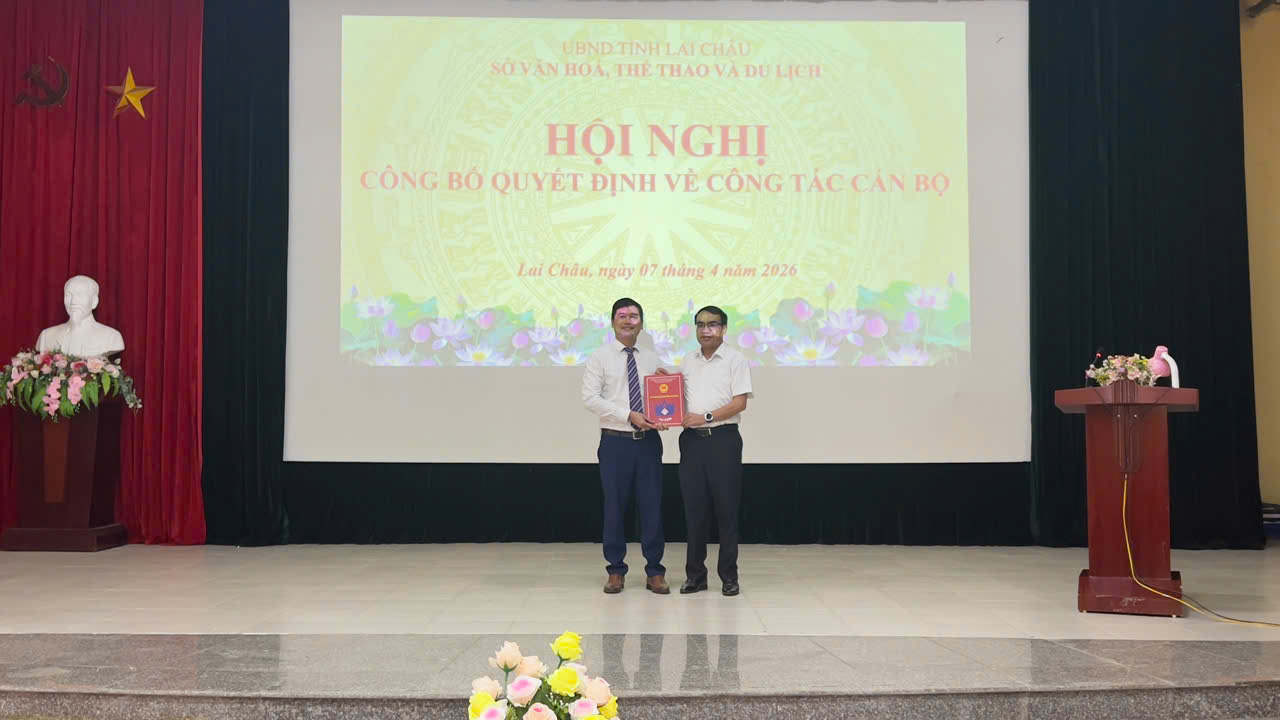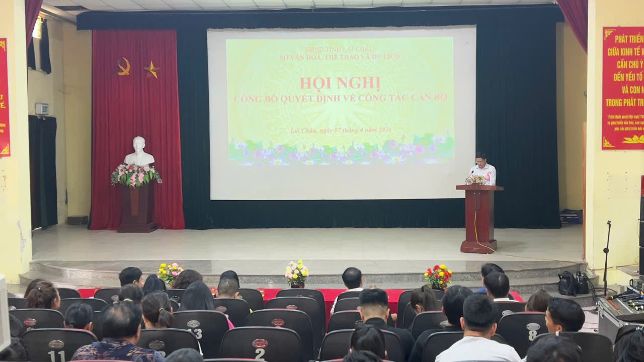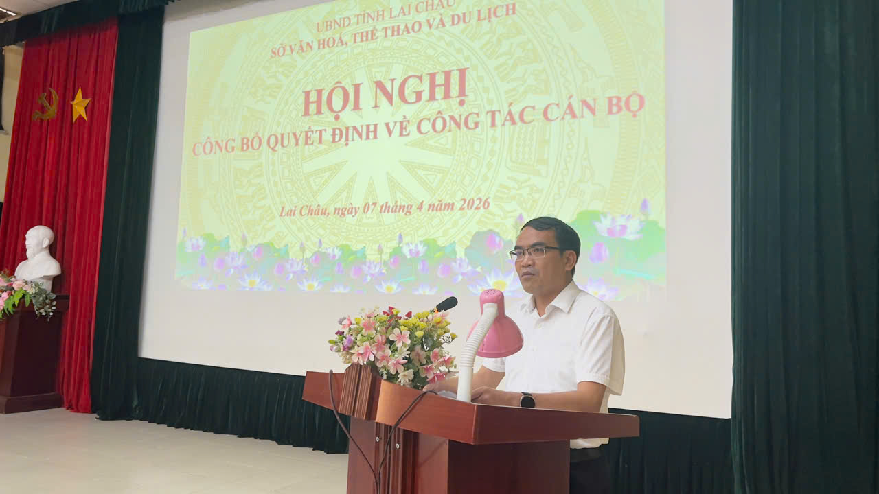 Chiều ngày 07/4/2026, Sở Văn hóa, Thể thao và Du lịch đã tổ chức Hội nghị công bố quyết định điều động, bổ nhiệm đồng chí Lê Huy Sơn, chuyên viên phòng Quản lý Văn hóa và Gia đình, giữ chức vụ Phó Giám đốc Trung tâm Văn hóa Nghệ thuật tỉnh.